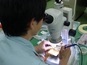 機械化が困難な「超微細半田配線加工、マイクロソルダリング」が得意分野です。顕微鏡を使い、AWG48番線までの細線と、0.2mmピッチの狭ピッチの手半田付けが可能です。高度化した医療の画像診断検査に欠かせない超音波診断装置に接続するプローブ(探触子)に、当社の超微細加工(配線, ポッティング, 組立)が生かされています。